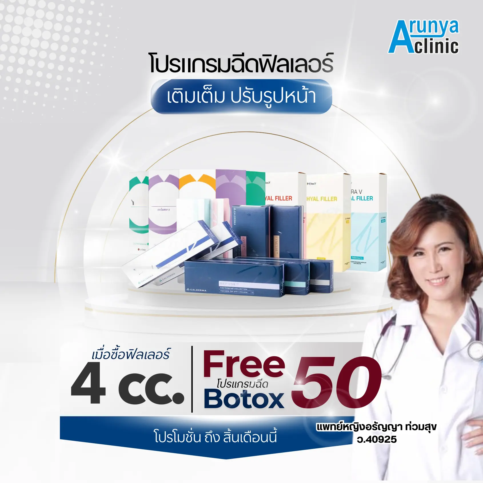 - ก่อตั้งโดยแพทย์ผู้เชี่ยวชาญ – คลินิกของเราดำเนินงานโดย แพทย์หญิงอรัญญา ท่วมสุข (คุณหมอเกด) แพทย์ที่มีประสบการณ์มากกว่า 15 ปี ในด้าน การปรับรูปหน้า โบท็อกซ์ ฟิลเลอร์ และเวชศาสตร์ชะลอวัย